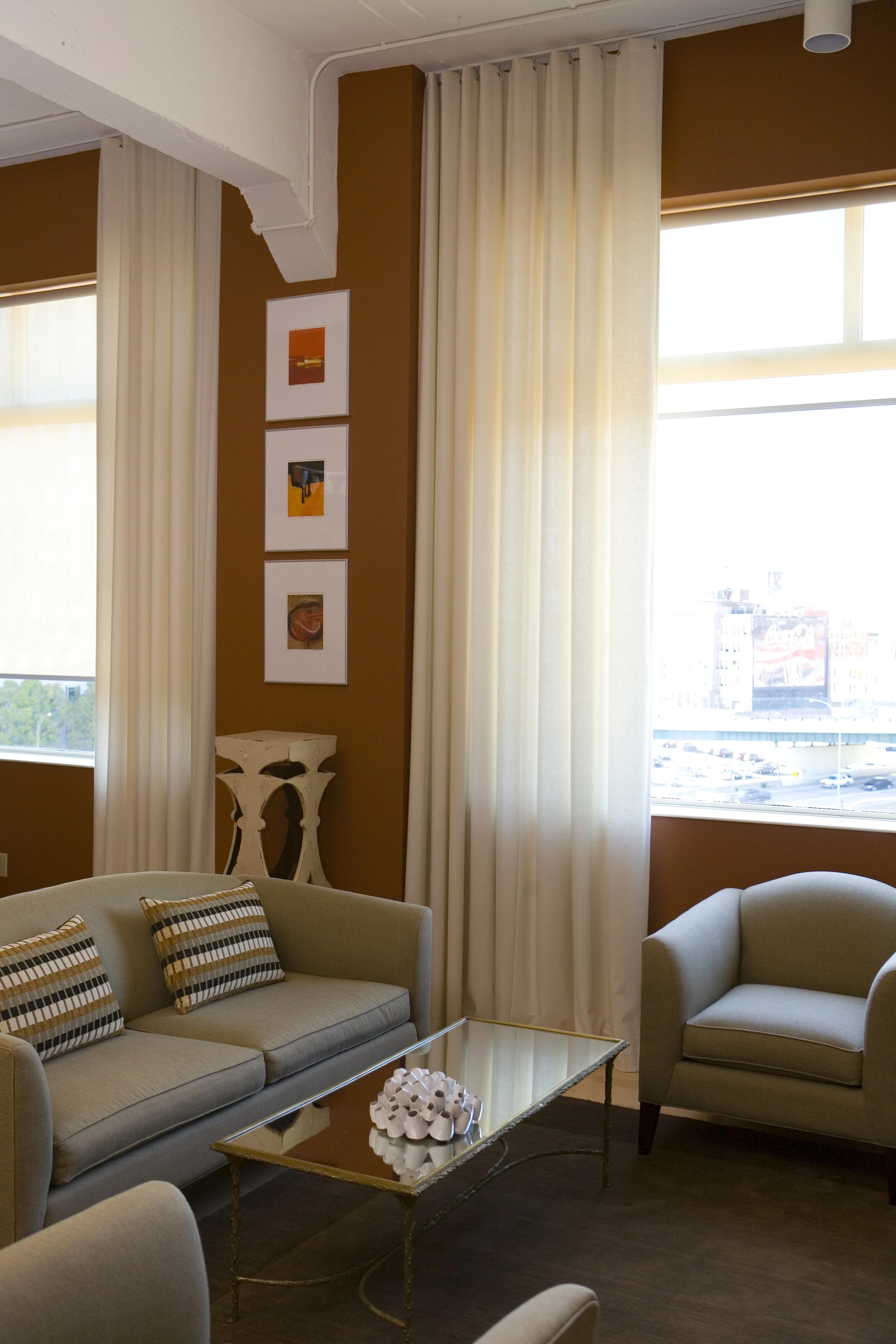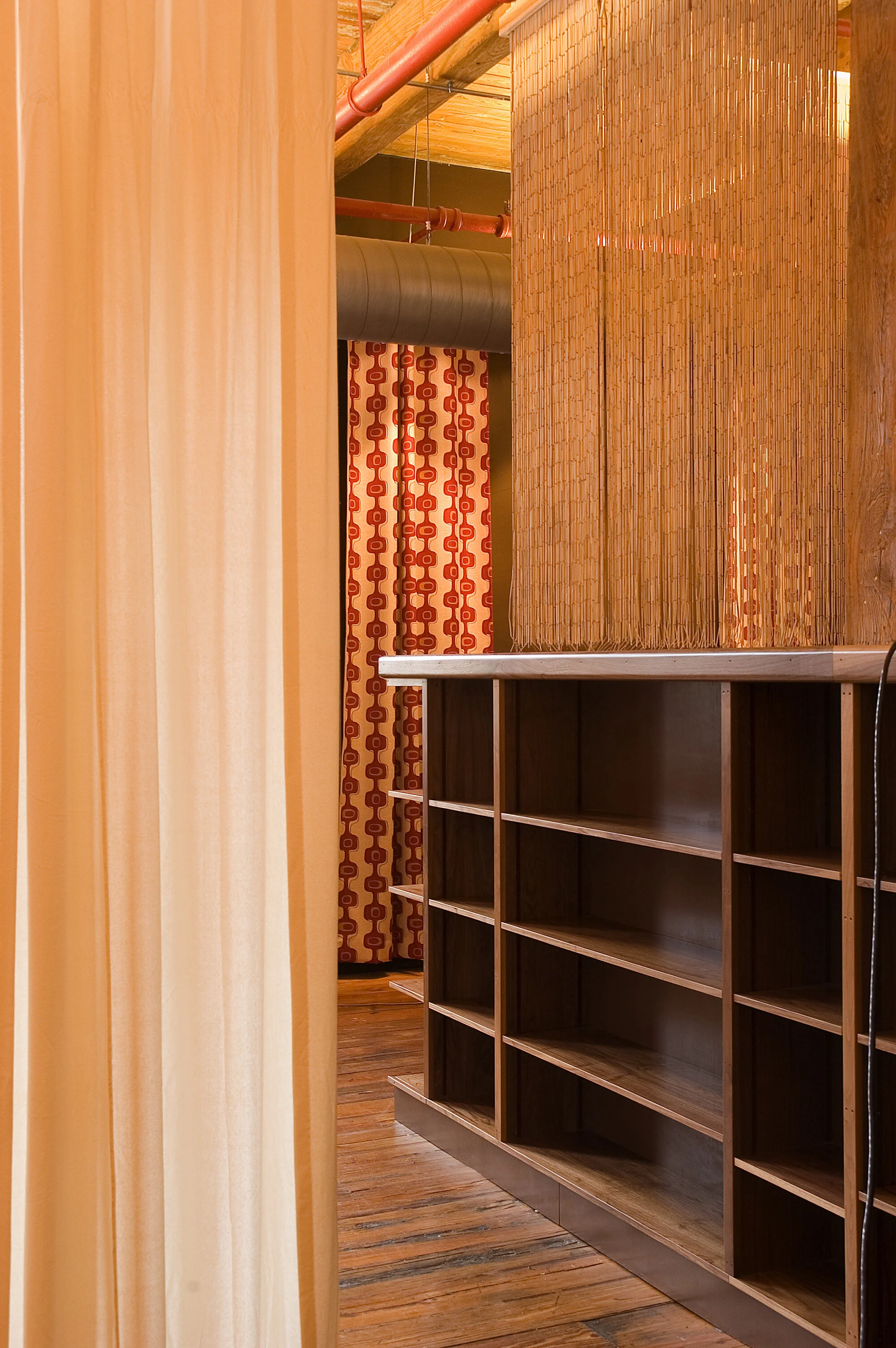 We collaborated with local craftsmen to custom build furniture and architectural fabric treatments to create room division and space definition in the multi-floor loft style space.