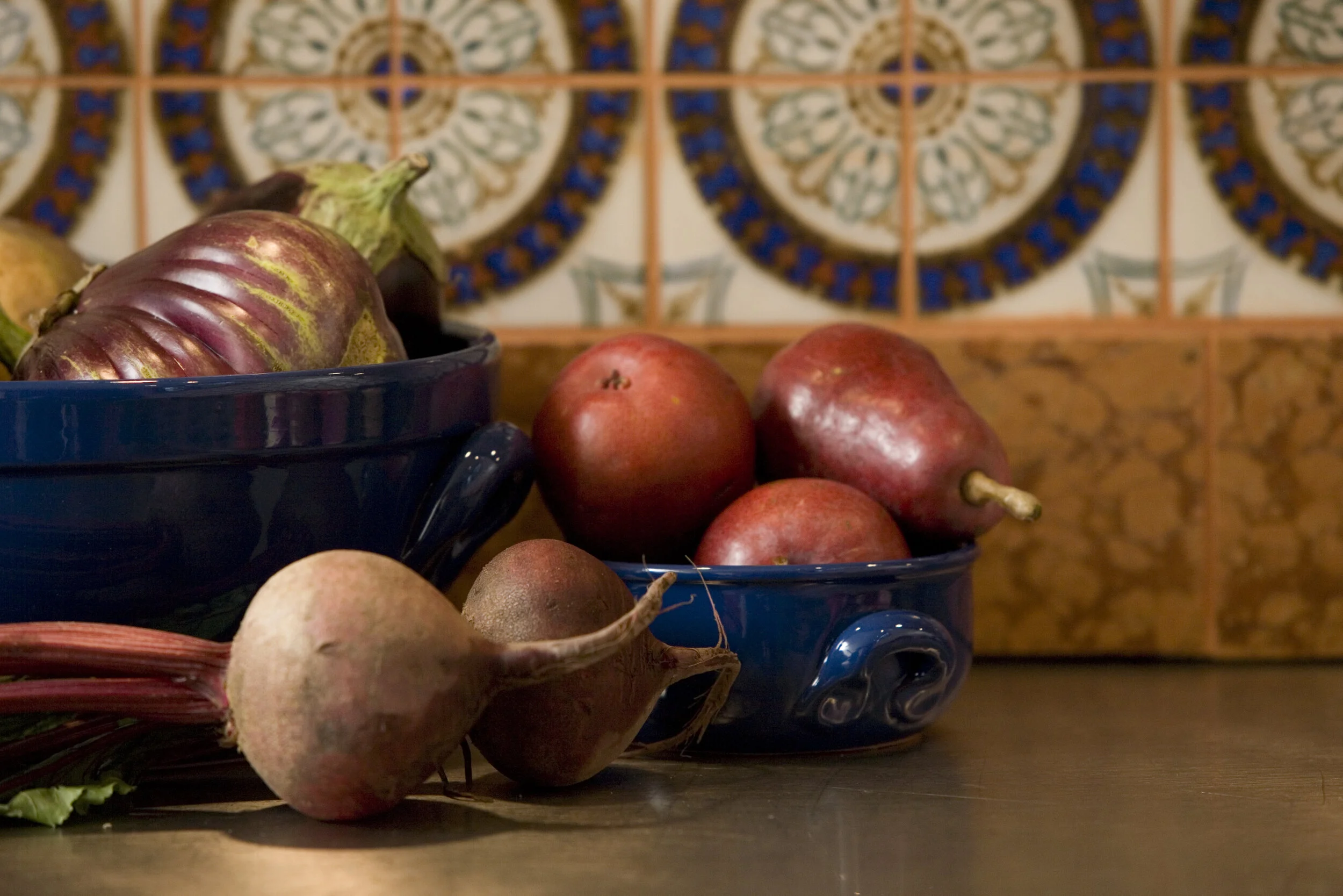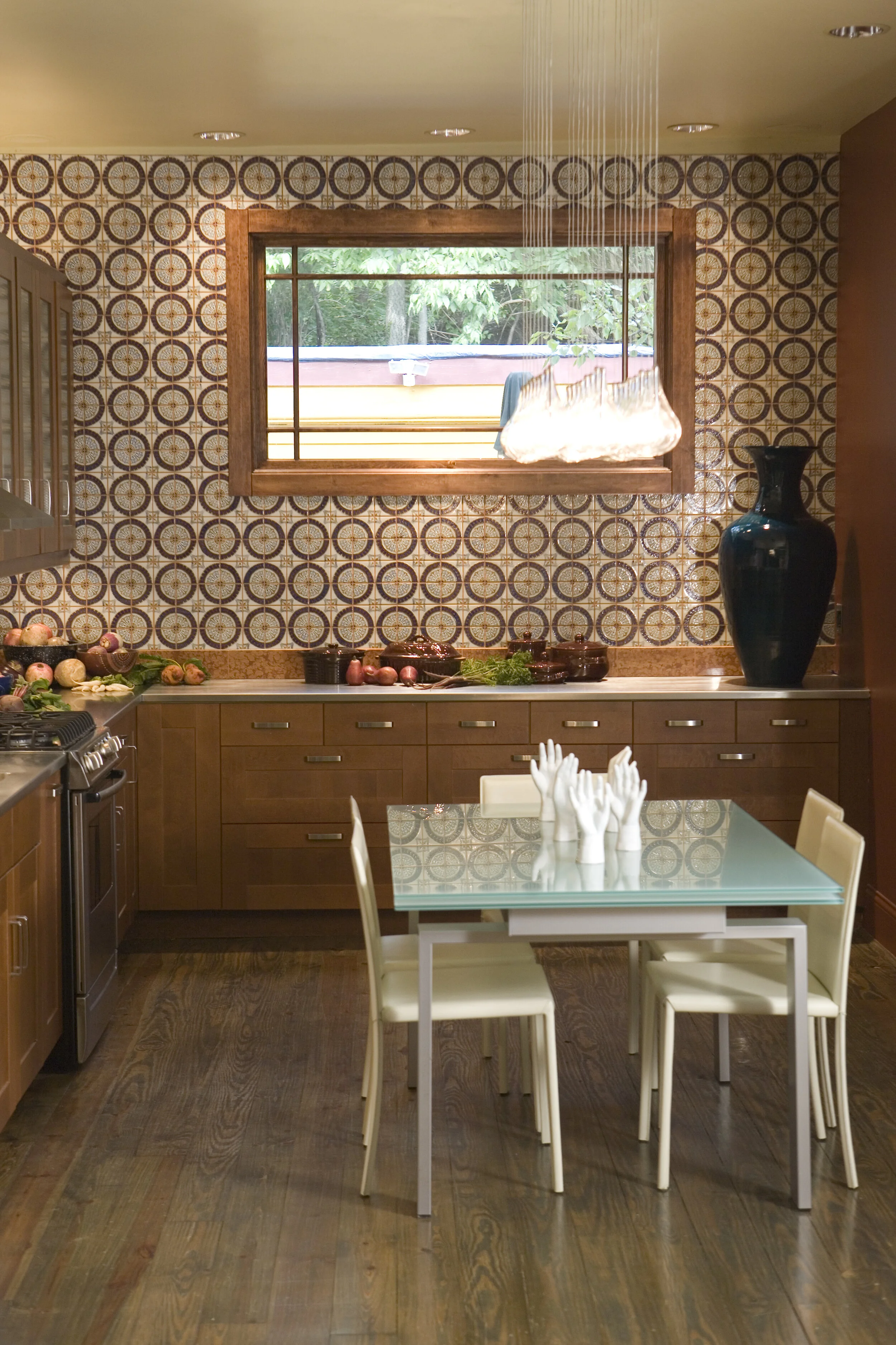 The kitchen was the only room in the house where artwork would not be a focal point. To keep the creative energy flowing, we found a bold Spanish tile in rust and cobalt for the kitchen. We covered the walls up to the ceiling along the countertop in the tile, to create a dramatic effect.
