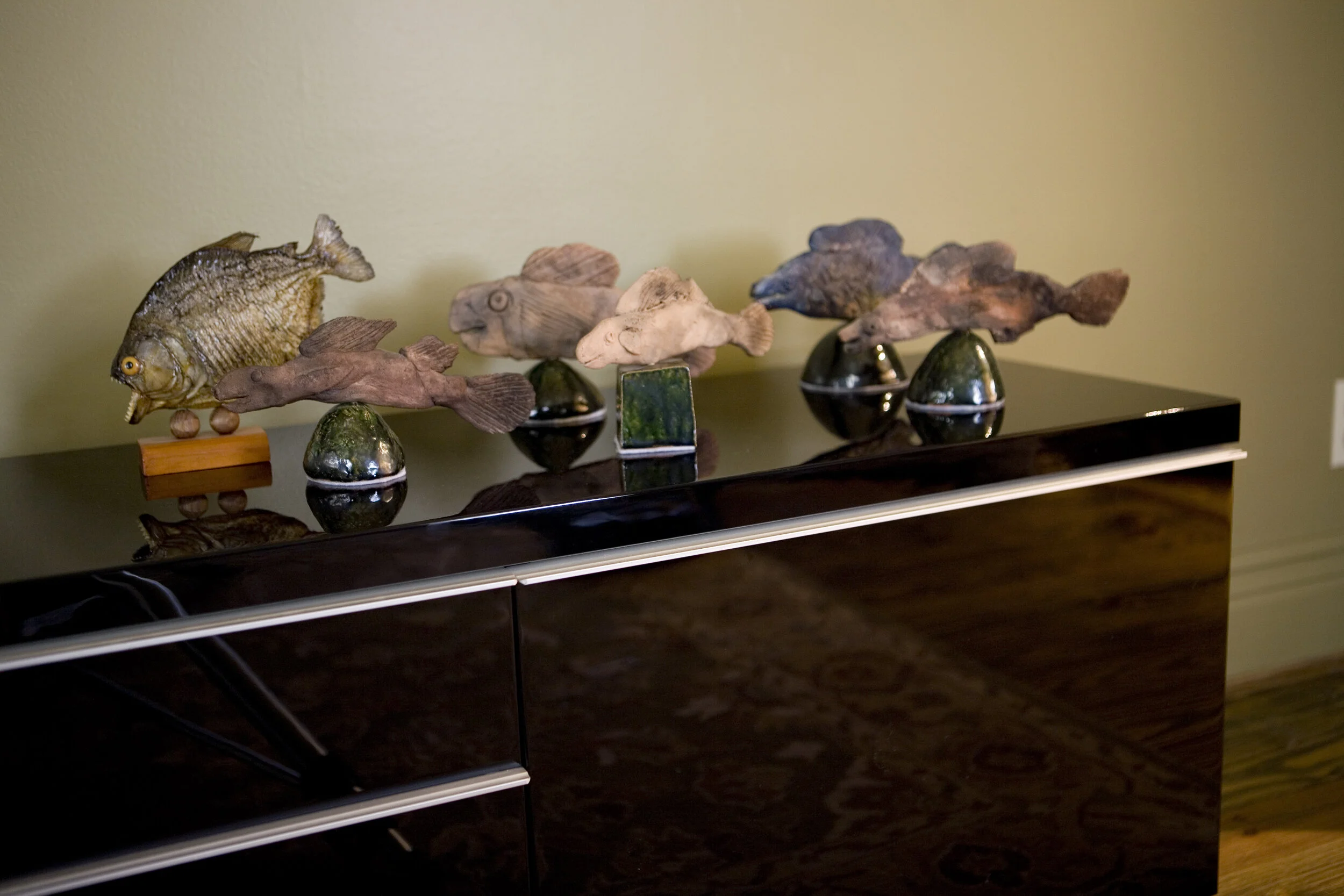 Sculptures, paintings, fiber arts and mixed media collages were some of the pieces we needed to showcase in this home. We pulled in colors from her artwork to create the palette : eggplant, chocolate, sage and wheat were the colors we wove through the house.