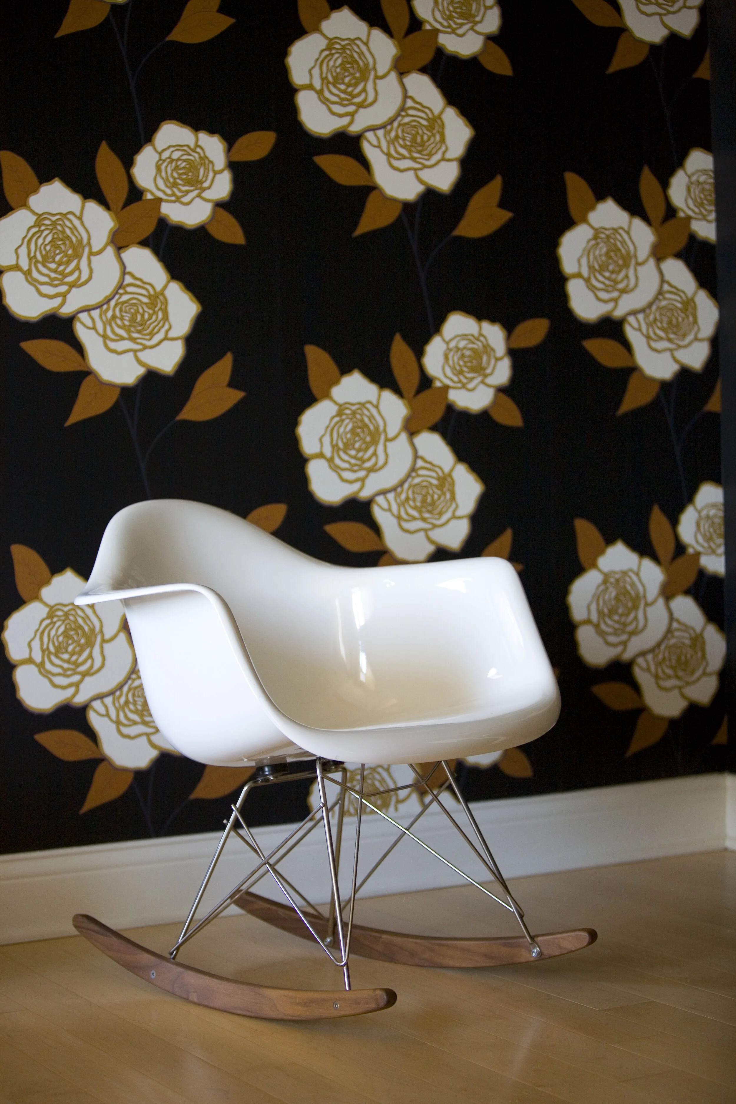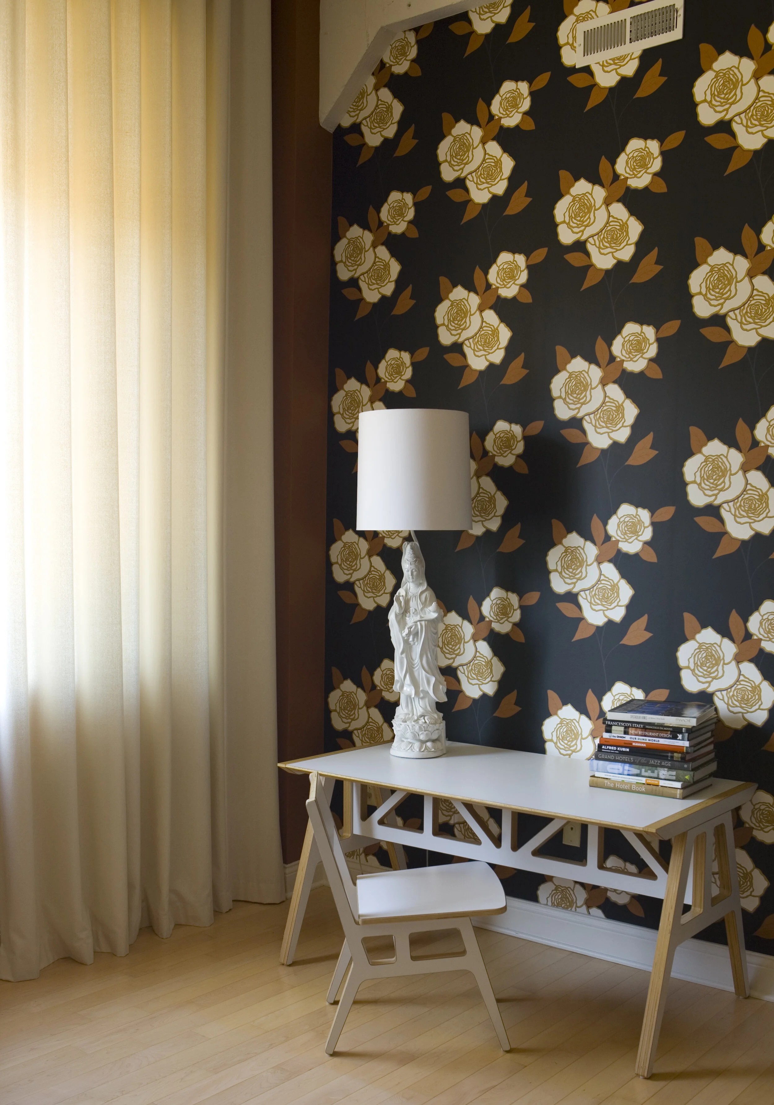 First we selected the color palette, which captured the tones in the floor and the furniture she was interested in keeping. We then found the striking Paper Roses wallpaper by Cole and Son which inspired the design concept for the home.
